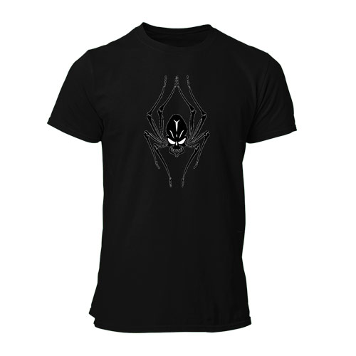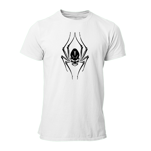 White t-shirt with black vinyl print.